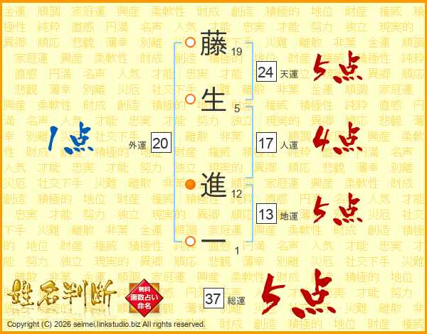 生活面を象徴する運勢です。外部から受ける影響力を表し、結婚運、家庭運や職場、環境への順応性を表します。総運から人運を引いた画数。姓や名が1文字の場合を除く。