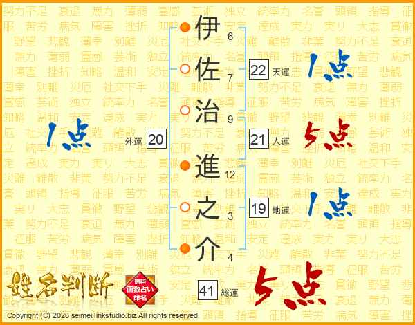 伊佐治進之介さんの総運は41画の5点!