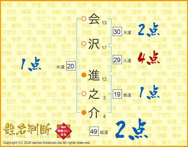 会(13画)沢(17画) 進(12画)之(3画)介(4画)