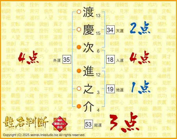 渡(13画)慶(15画)次(6画) 進(12画)之(3画)介(4画)