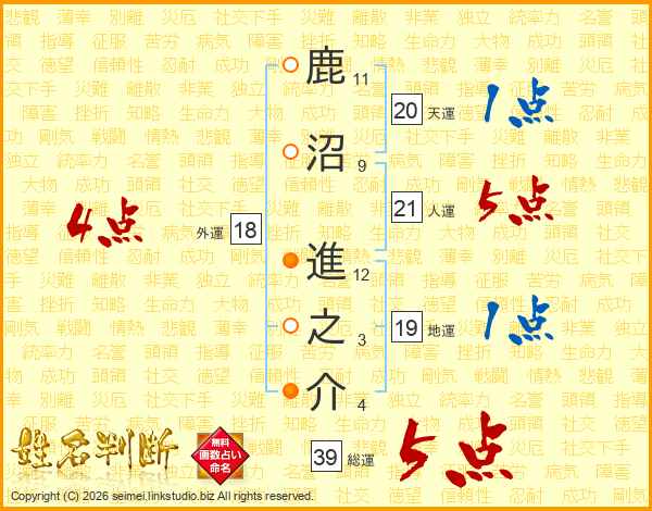 鹿沼進之介さんの総運は39画の5点!