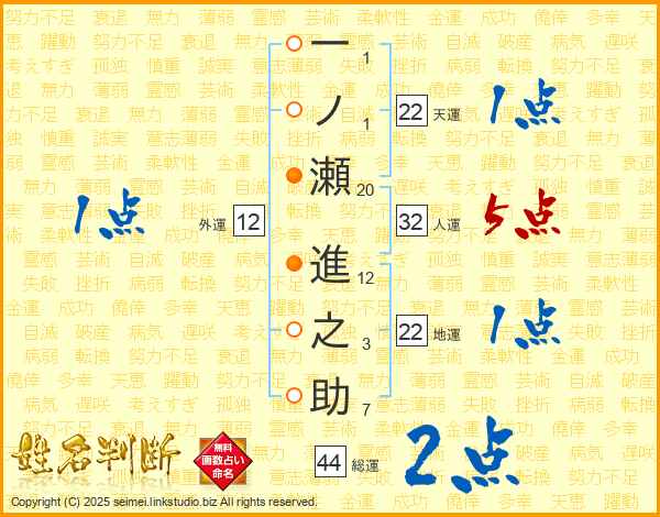 一(1画)ノ(1画)瀬(20画) 進(12画)之(3画)助(7画)