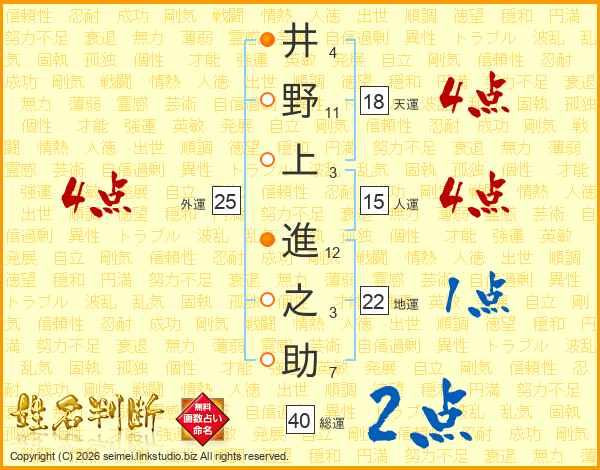 井(4画)野(11画)上(3画) 進(12画)之(3画)助(7画)