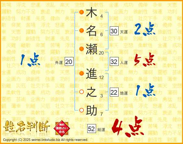 木(4画)名(6画)瀬(20画) 進(12画)之(3画)助(7画)