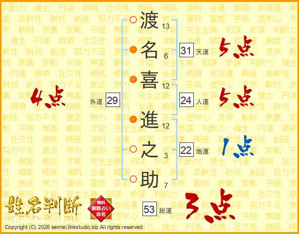 渡(13画)名(6画)喜(12画) 進(12画)之(3画)助(7画)