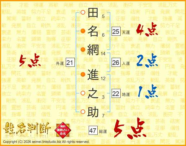 田(5画)名(6画)網(14画) 進(12画)之(3画)助(7画)