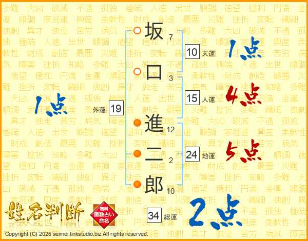 坂(7画)口(3画) 進(12画)二(2画)郎(10画)