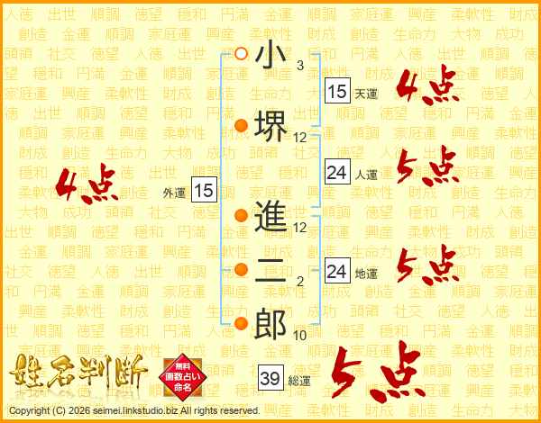 小堺進二郎さんの総運は39画の5点!