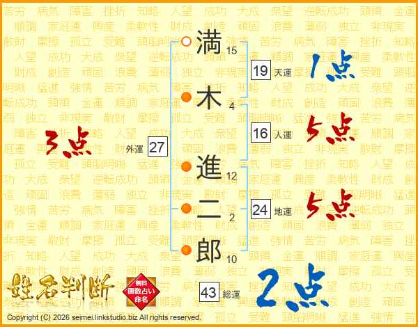 満(15画)木(4画) 進(12画)二(2画)郎(10画)