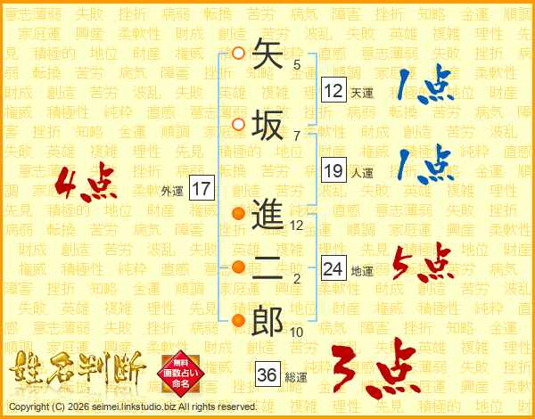 矢(5画)坂(7画) 進(12画)二(2画)郎(10画)