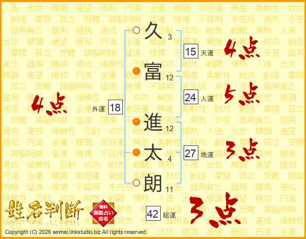 久(3画)富(12画) 進(12画)太(4画)朗(11画)