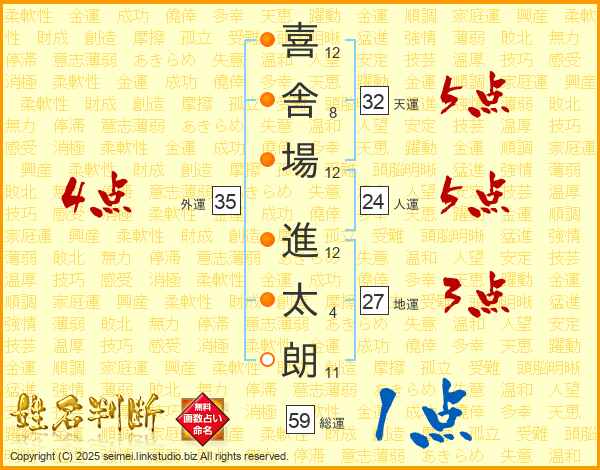 喜(12画)舎(8画)場(12画) 進(12画)太(4画)朗(11画)