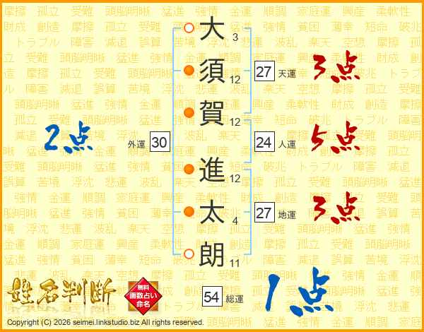 大(3画)須(12画)賀(12画) 進(12画)太(4画)朗(11画)