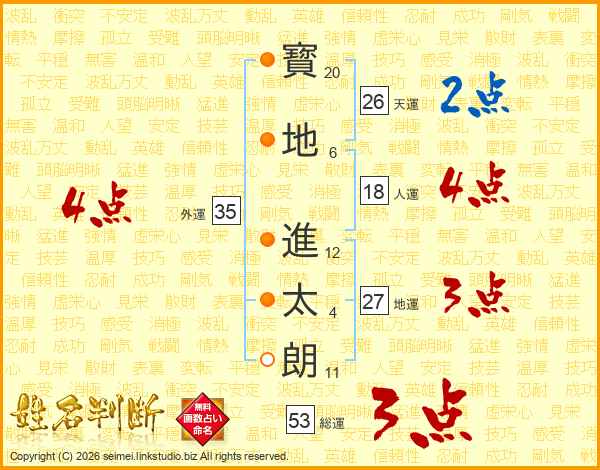 寳(20画)地(6画) 進(12画)太(4画)朗(11画)