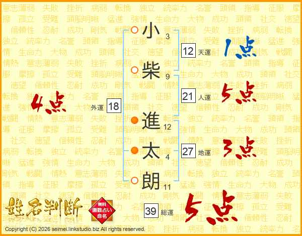 小(3画)柴(9画) 進(12画)太(4画)朗(11画)