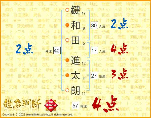 鍵(17画)和(8画)田(5画) 進(12画)太(4画)朗(11画)