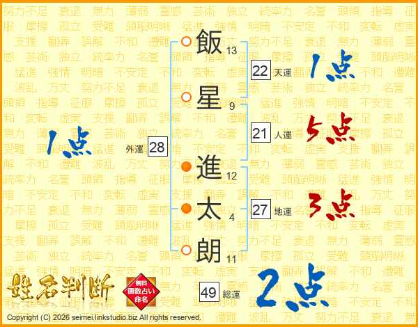 飯(13画)星(9画) 進(12画)太(4画)朗(11画)