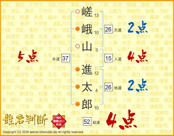 嵯峨山進太郎さんの総運は52画の4点!