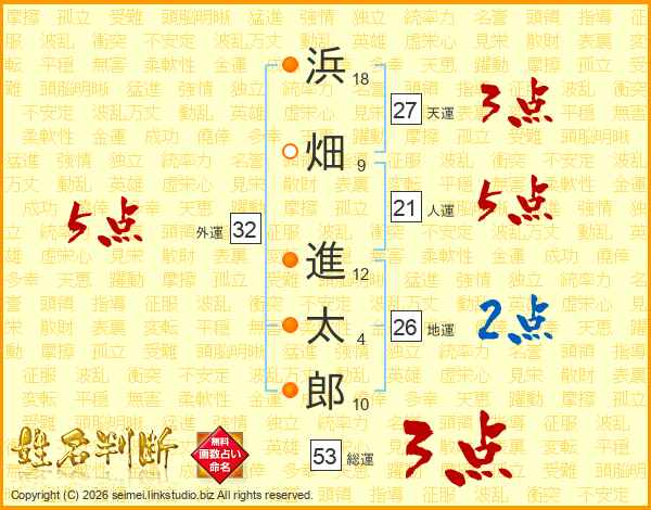 浜畑進太郎さんの総運は53画の3点!