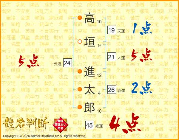 高(10画)垣(9画) 進(12画)太(4画)郎(10画)