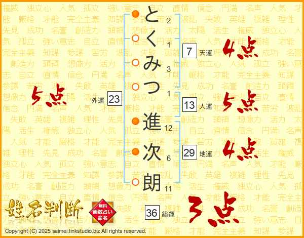 と(2画)く(1画)み(3画)つ(1画) 進(12画)次(6画)朗(11画)