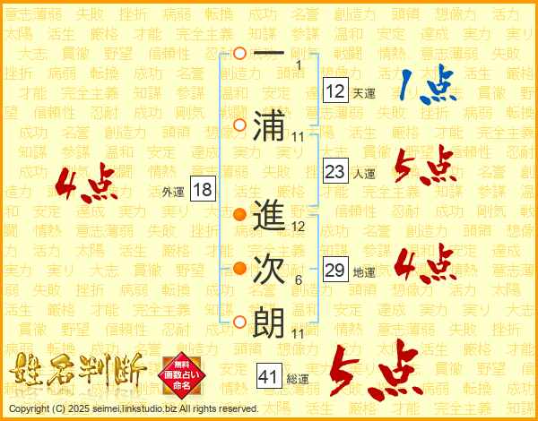 一(1画)浦(11画) 進(12画)次(6画)朗(11画)