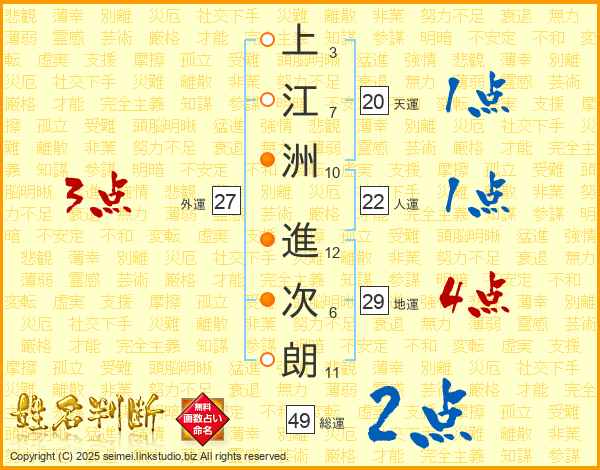上(3画)江(7画)洲(10画) 進(12画)次(6画)朗(11画)