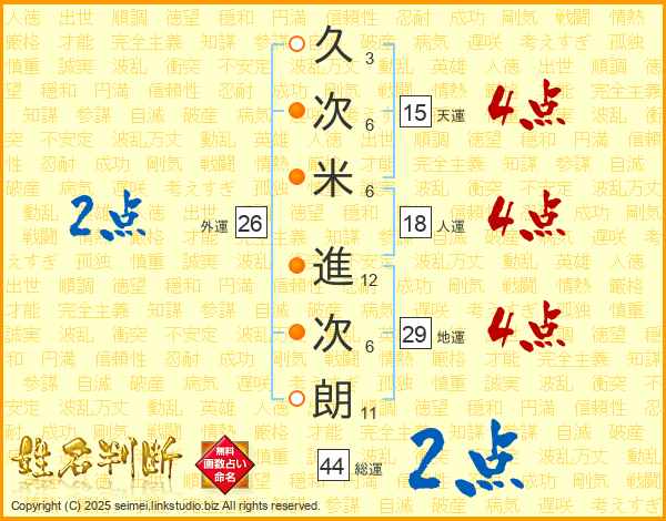 久(3画)次(6画)米(6画) 進(12画)次(6画)朗(11画)