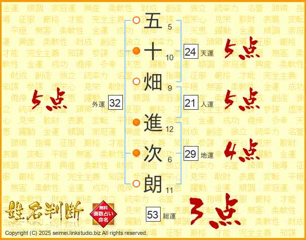 五(5画)十(10画)畑(9画) 進(12画)次(6画)朗(11画)