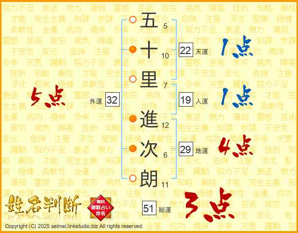 あなたの人生を表す1番重要な運勢です。生涯を通じて影響する総合運となり、主に50歳以降の晩年期に影響を及ぼします。苗字と名前の合計画数。