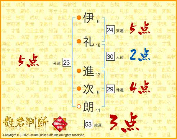伊(6画)礼(18画) 進(12画)次(6画)朗(11画)
