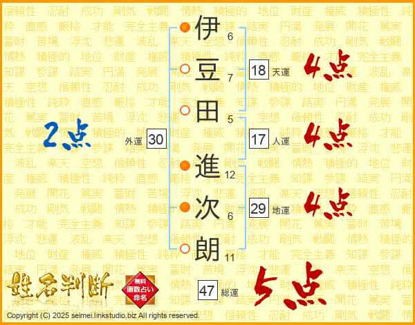 伊(6画)豆(7画)田(5画) 進(12画)次(6画)朗(11画)