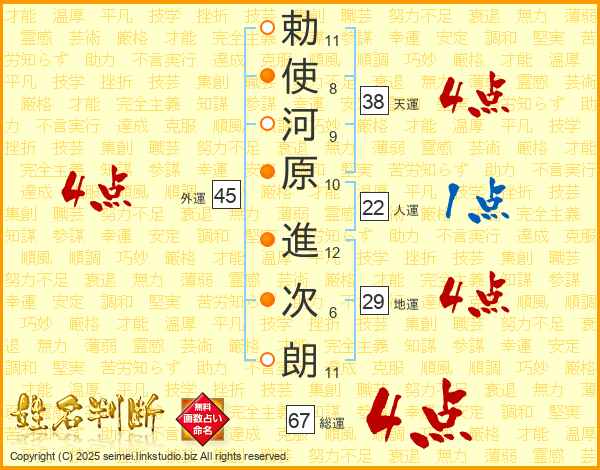 勅(11画)使(8画)河(9画)原(10画) 進(12画)次(6画)朗(11画)