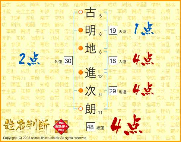古(5画)明(8画)地(6画) 進(12画)次(6画)朗(11画)