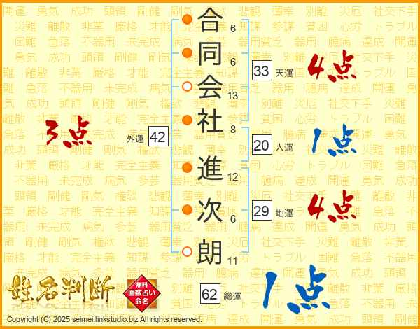 合(6画)同(6画)会(13画)社(8画) 進(12画)次(6画)朗(11画)