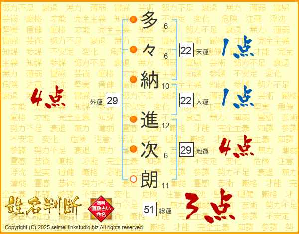 多(6画)々(6画)納(10画) 進(12画)次(6画)朗(11画)