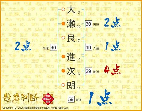 大(3画)瀬(20画)良(7画) 進(12画)次(6画)朗(11画)