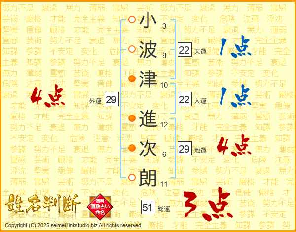 小(3画)波(9画)津(10画) 進(12画)次(6画)朗(11画)