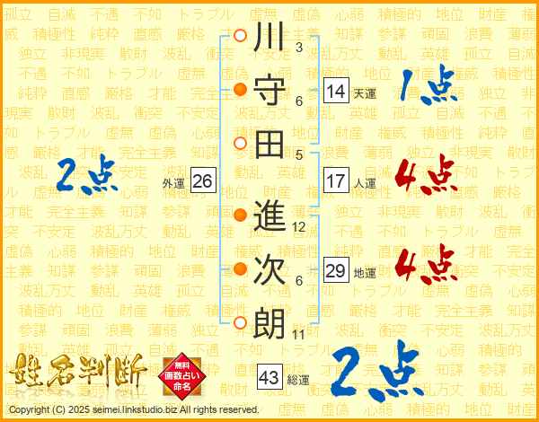 川(3画)守(6画)田(5画) 進(12画)次(6画)朗(11画)