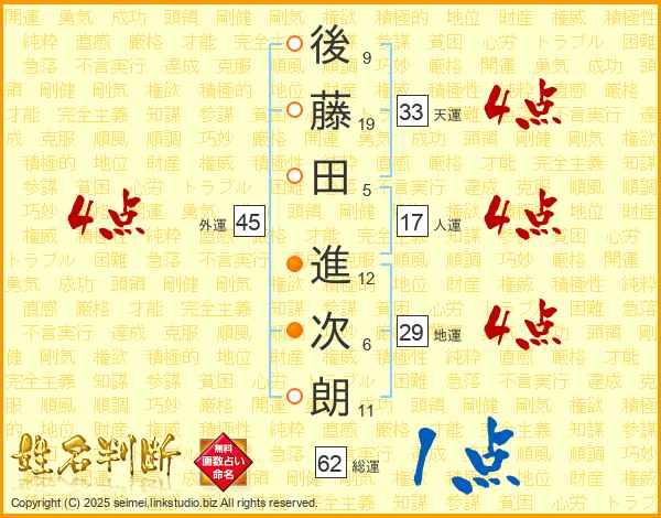 後(9画)藤(19画)田(5画) 進(12画)次(6画)朗(11画)