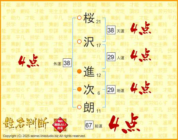 桜(21画)沢(17画) 進(12画)次(6画)朗(11画)