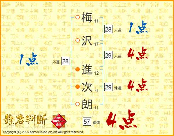 梅(11画)沢(17画) 進(12画)次(6画)朗(11画)