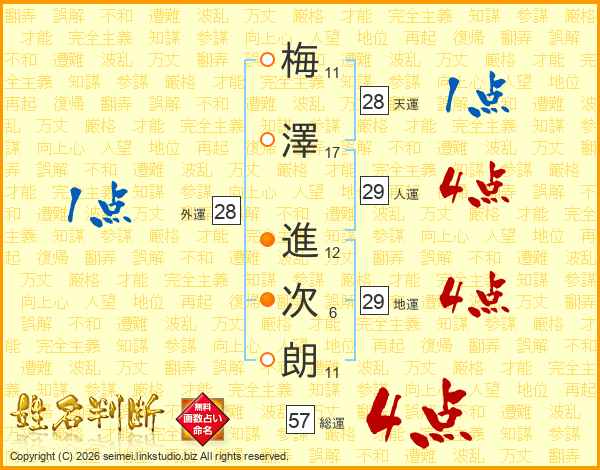 梅(11画)澤(17画) 進(12画)次(6画)朗(11画)