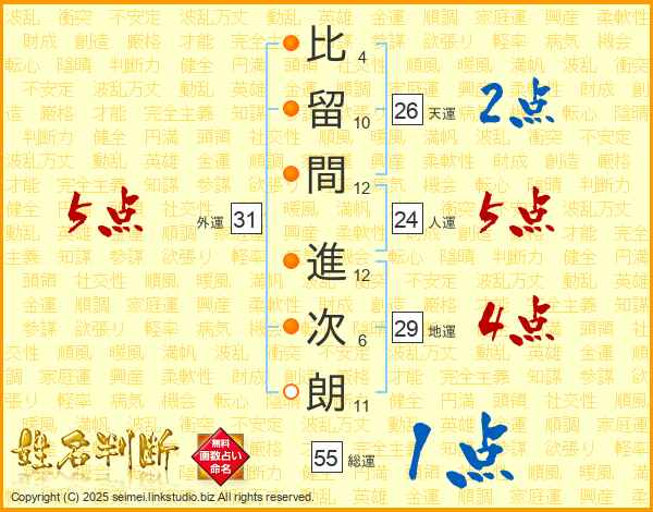 比(4画)留(10画)間(12画) 進(12画)次(6画)朗(11画)