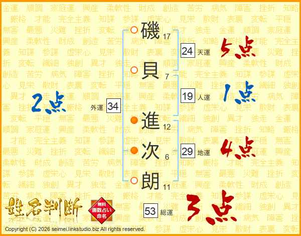 磯(17画)貝(7画) 進(12画)次(6画)朗(11画)
