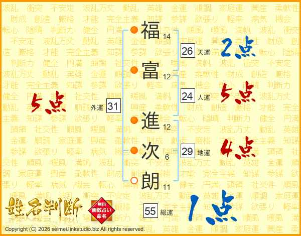 福(14画)富(12画) 進(12画)次(6画)朗(11画)