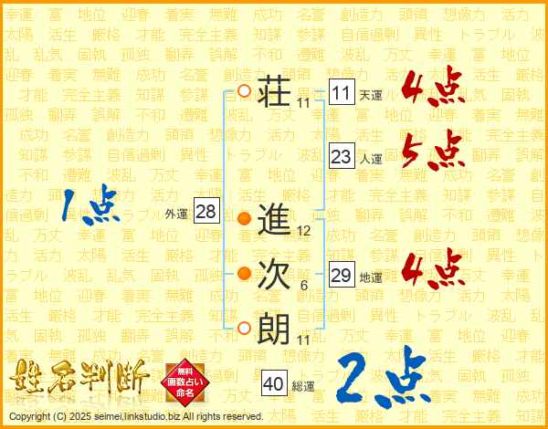 あなたの人生を表す1番重要な運勢です。生涯を通じて影響する総合運となり、主に50歳以降の晩年期に影響を及ぼします。苗字と名前の合計画数。