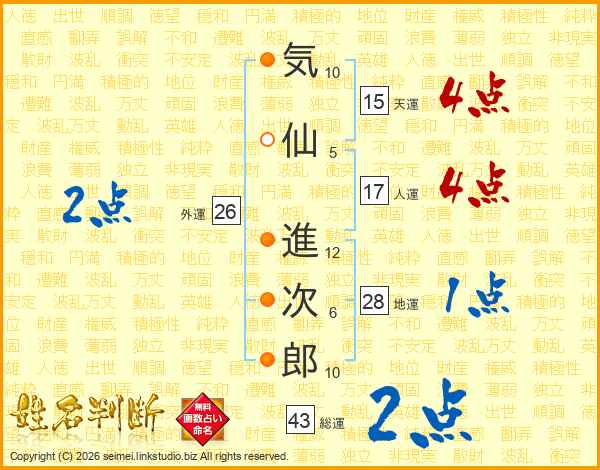 気(10画)仙(5画) 進(12画)次(6画)郎(10画)