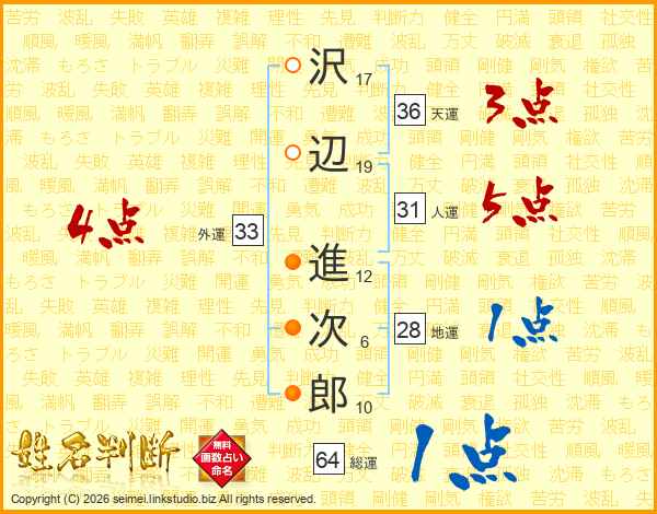 沢(17画)辺(19画) 進(12画)次(6画)郎(10画)