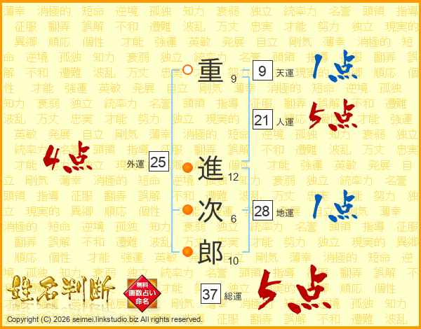 あなたの人生を表す1番重要な運勢です。生涯を通じて影響する総合運となり、主に50歳以降の晩年期に影響を及ぼします。苗字と名前の合計画数。